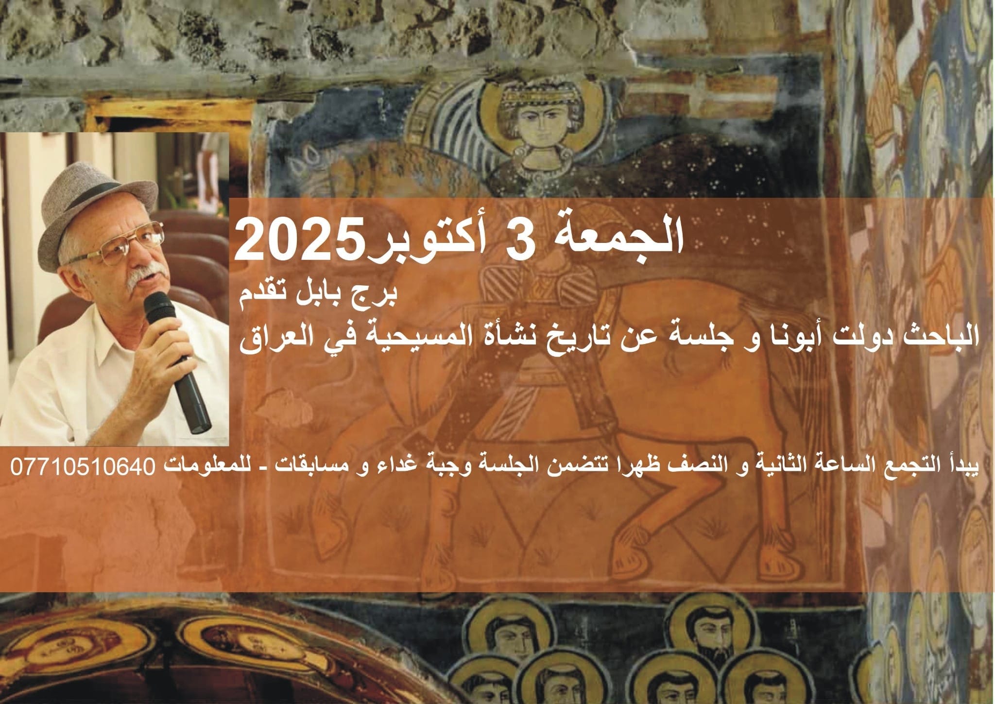 نظمت برج بابل أمسية إستضافت فيها الصحفي الباحث “دولت أبونا” للحديث عن تاريخ نشأة المسيحية في العراق و تطرق فيها إلى تعريف عدد من المصطلحات الكنسية المتداولة و من الجدير بالذكر فإن بدايات المسيحية في العراق تعود للقرن الأول الميلادي و تعد كنيسة “كوخي” في منطقة عرب جبور من أول الكنائس التي إنشئت في العراق